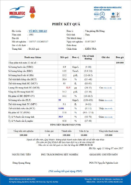Toàn bộ các kết quả xét nghiệm và chẩn đoán hình ảnh sẽ được hiển thị trên website: medlatec.vn.